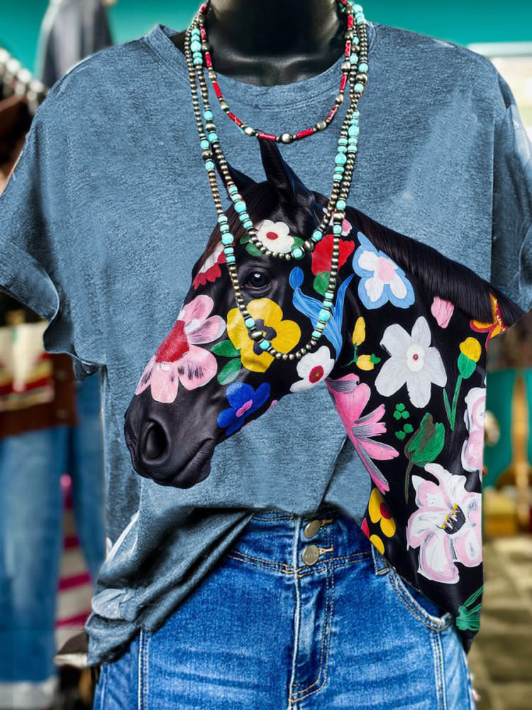 Colorful Floral Horse Print Casual Round Neck Short Sleeve T-Shirt