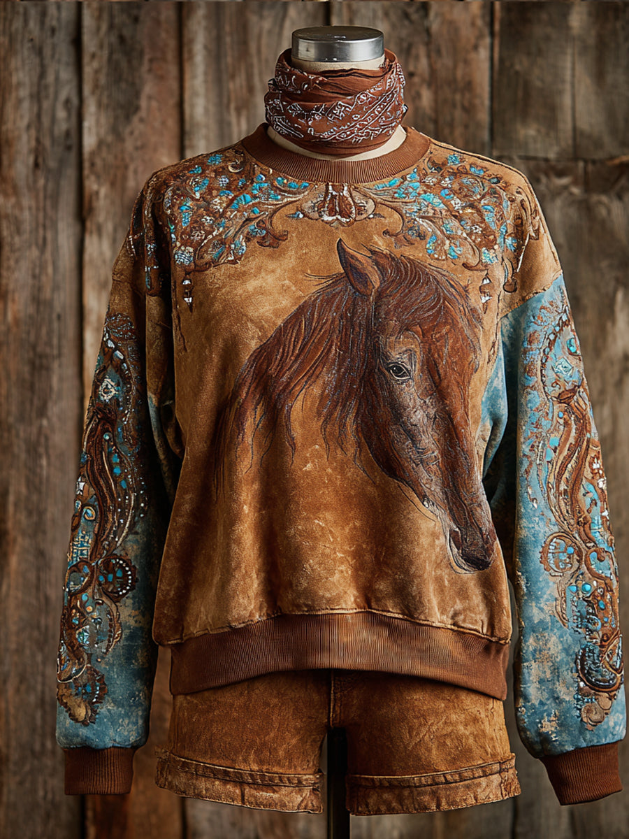 Retro Western Horse Art Floral Print Casual Sweatshirt