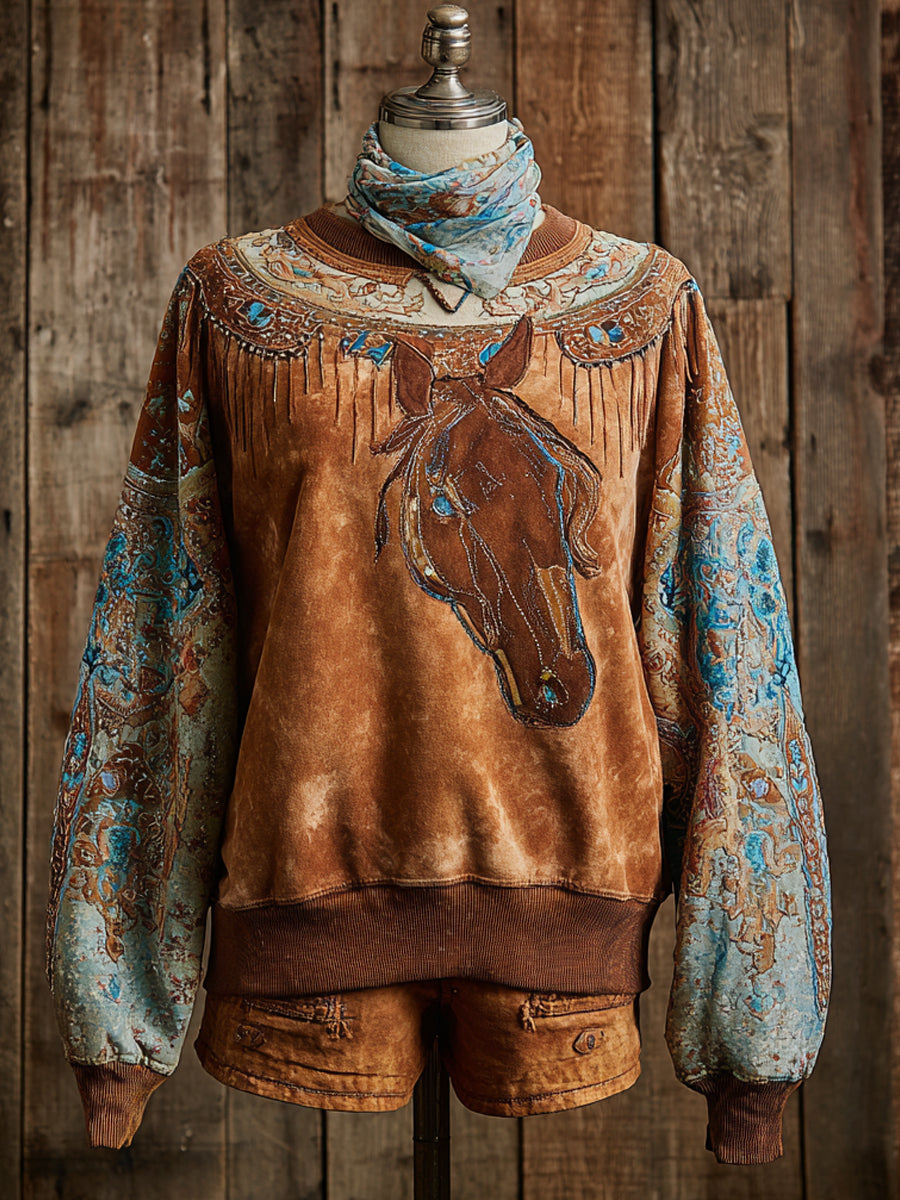 Retro Western Horse Art Floral Print Casual Sweatshirt