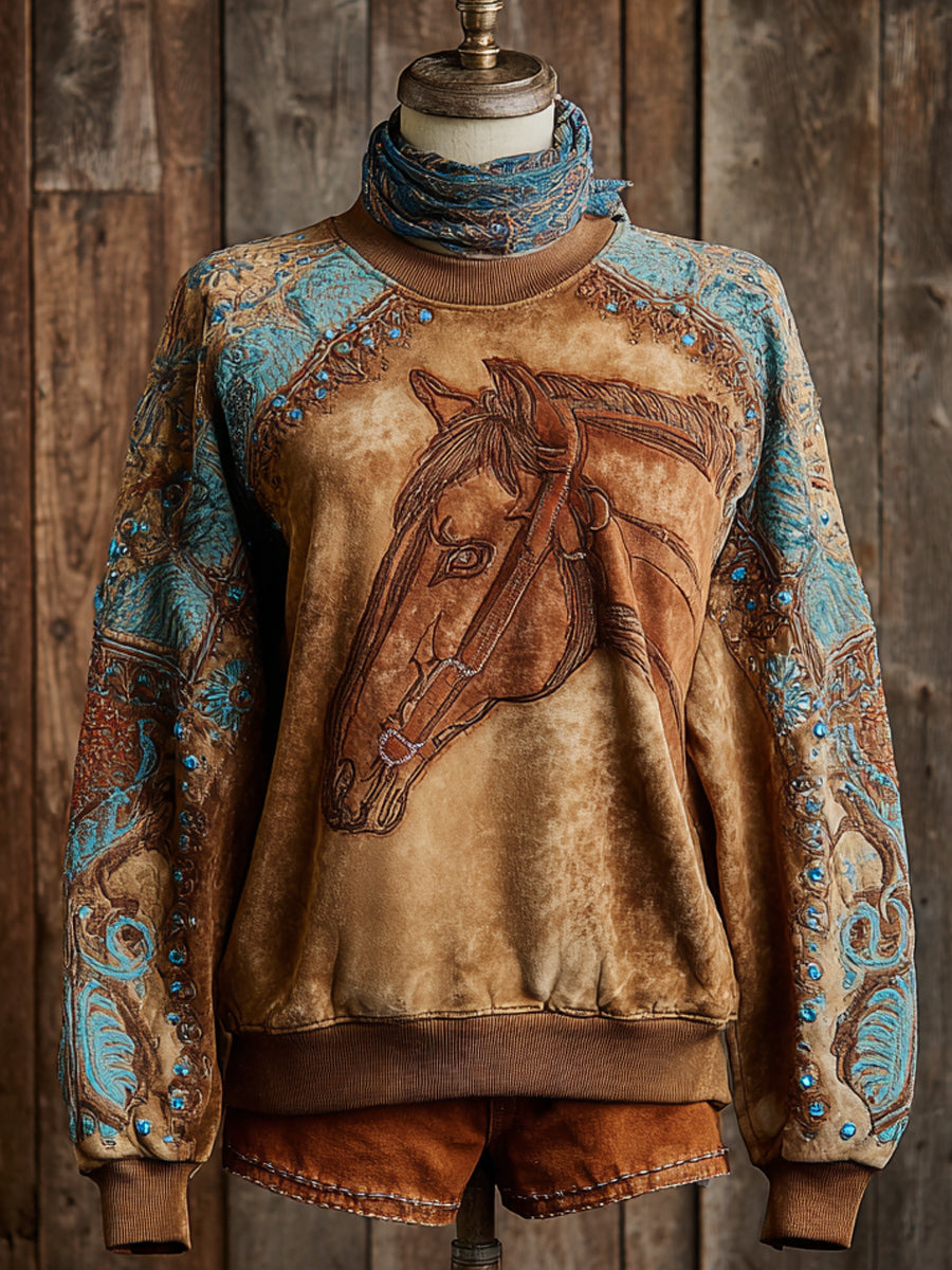 Retro Western Horse Art Floral Print Casual Sweatshirt