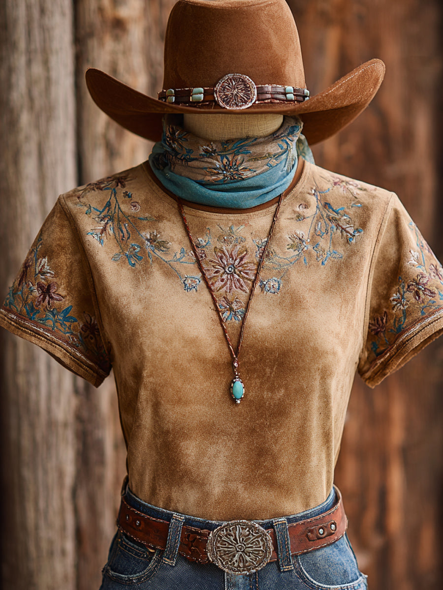 Retro Western Style Floral Print Casual Short Sleeve T-Shirt