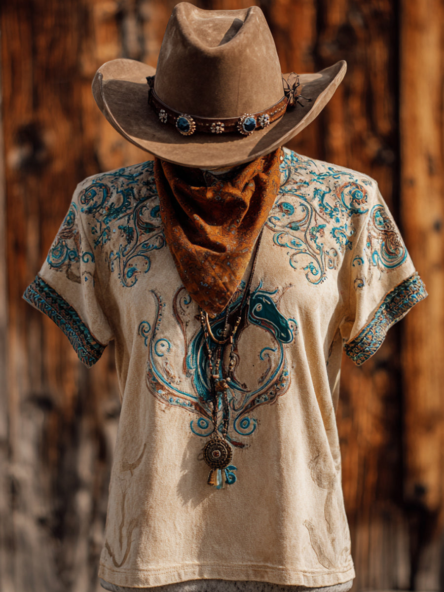 Retro Western Style Floral Print Casual Short Sleeve T-Shirt