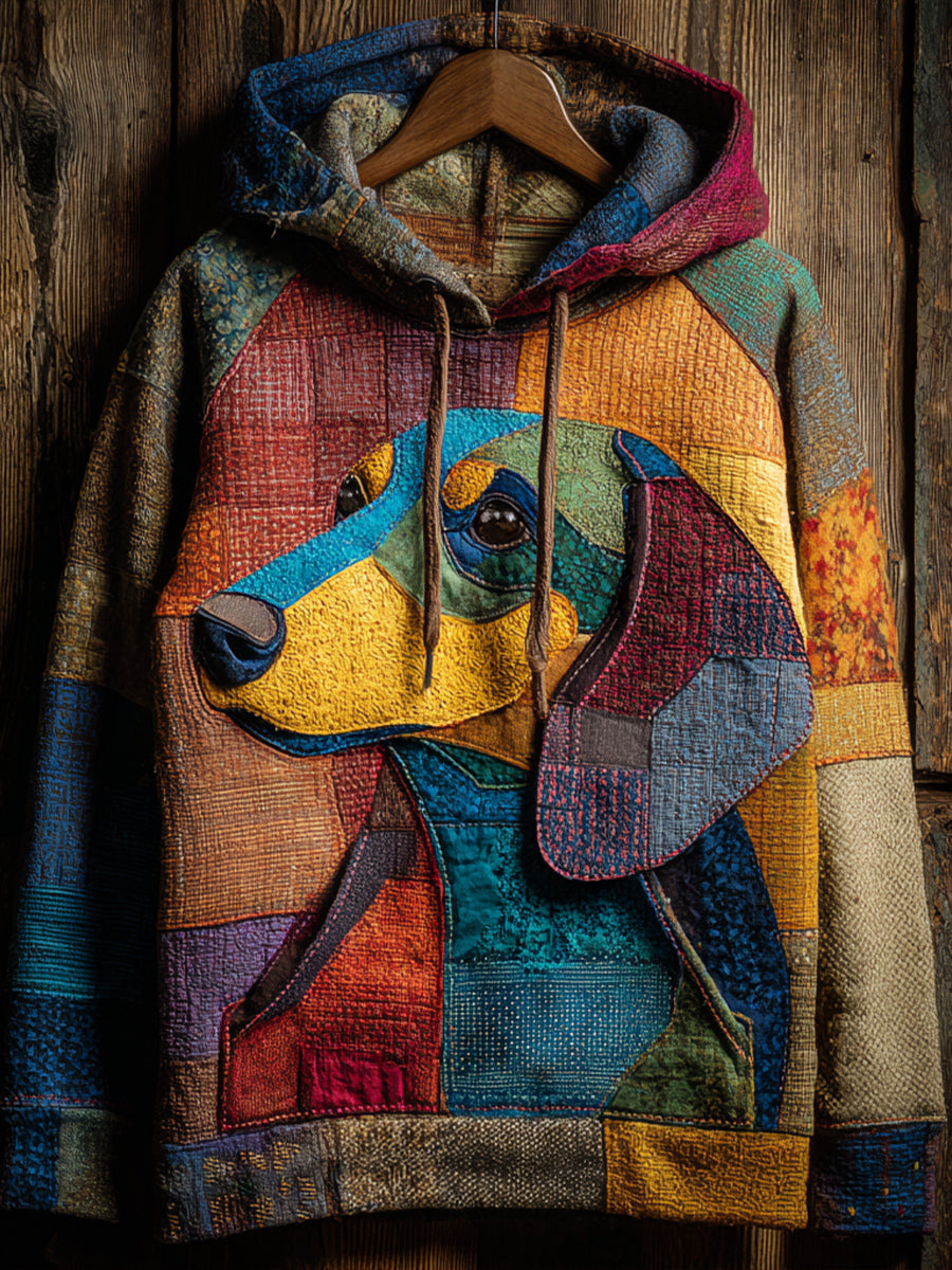 Vintage Patchwork Dog Print Art Casual Hoodie