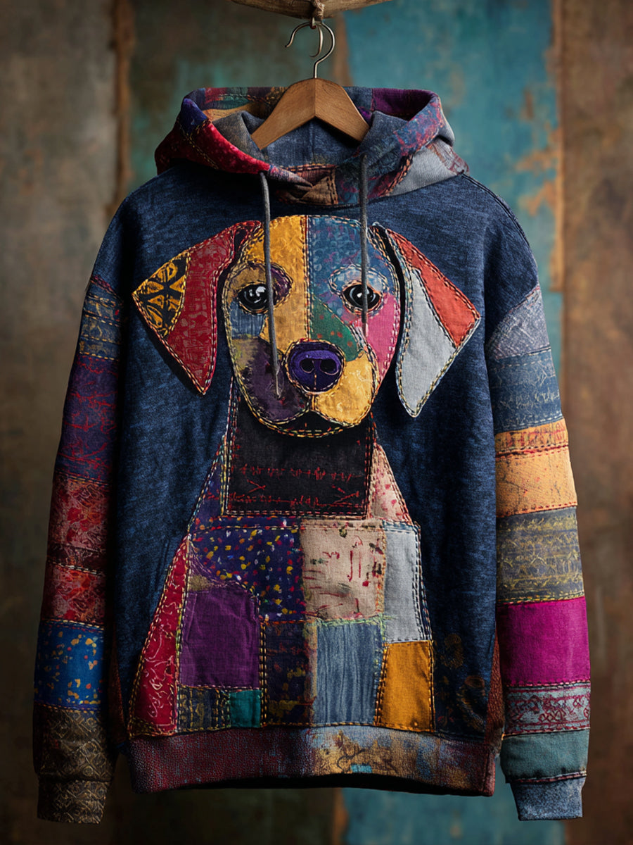 Vintage Patchwork Dog Print Art Casual Hoodie