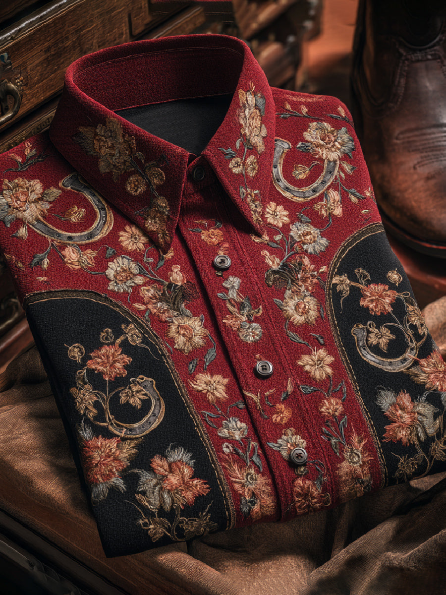 Vintage Western Art Print Casual Long Sleeve Button-Down Shirt